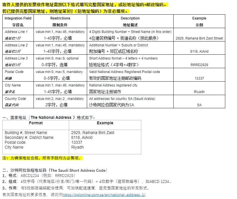 以上要求适用于我司所有出口渠道,寄运沙特货件务必提供完整的沙特国家地址或沙特短地址码,发票地址需按照如下格式填报收件人地址,我司将不再逐一审核收件人地址,如因收件地址不符合当地要求,相关货件将可能会因此延误甚至退回,因此产生的一切后果及费用均由寄件人承担。